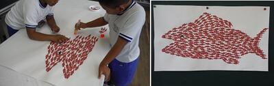 さくらの2年生は国語で『スイミー』の学習をしています。小さな魚の形に紙を切って、大きな魚になるように貼りつけました。