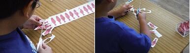 さくらでは、自立活動の時間に「かたるた」というカードゲームをしました。楽しくコミュニケーションをとること、周囲に話題を合わせることをねらいとしています。順番にカードを引いて、カードに書いてあるつなぎ言葉を使って、前の人の話を受けてつないでいく遊びです。6人がそれぞれ盛り上げようと楽しいお話を展開してくれました。