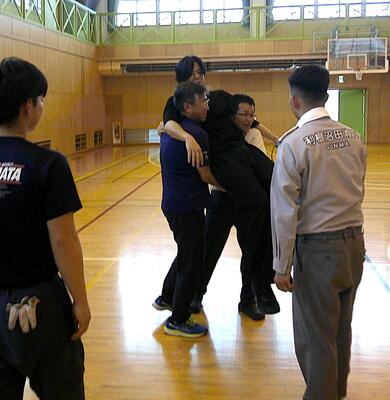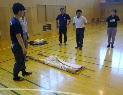 心臓マッサージやAEDを使った心肺蘇生の方法をはじめ、負傷者が出た場合の搬送の仕方、喉に異物を詰まらせた場合の対応の仕方などを、実技を通して教えていただきました。