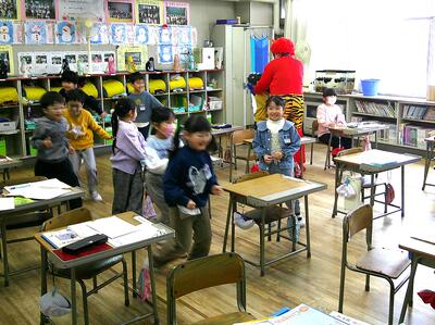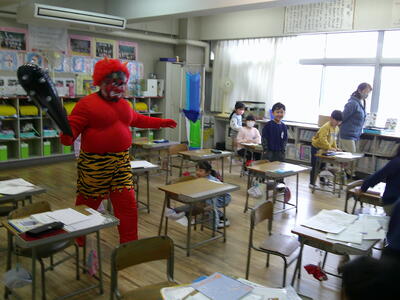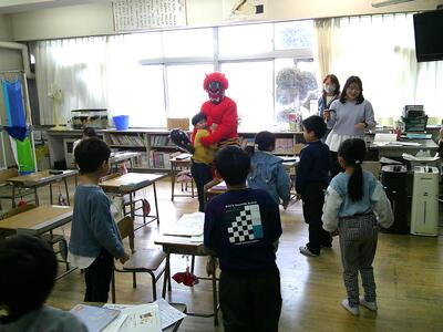 2月3日(火)節分、低学年の教室に鬼が出ました。子どもたちは、鬼が来ると、大喜びで逃げ回り、「鬼は外、福は内」と言いながら、追い払いました。